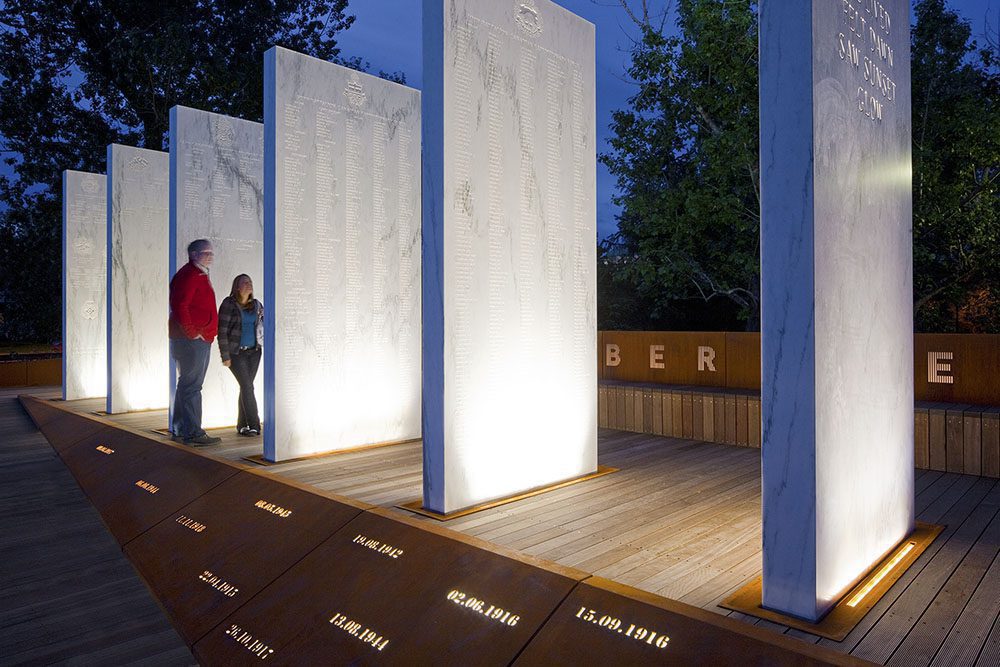 LED architectural and accent lighting enhances safety and draws attention to the memorial. The marble tablets, illuminated by engraved names and the inscription “We Will Remember Them,” become even more striking at night.