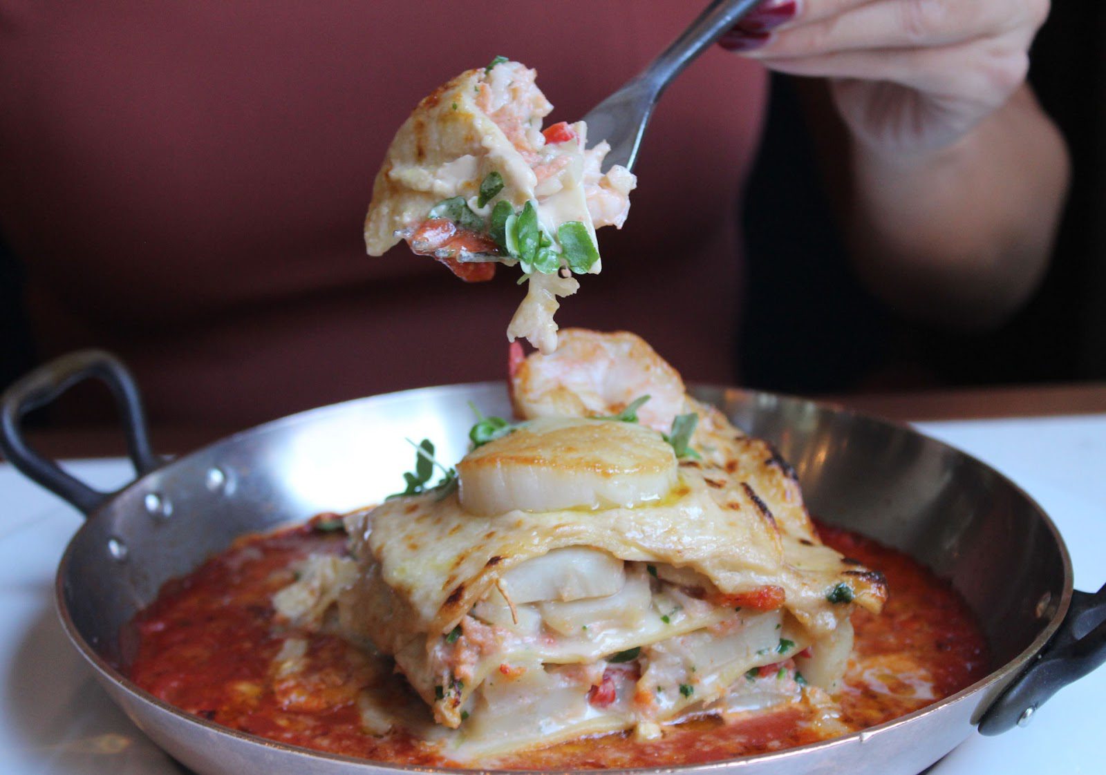 Ця культова страва в меню калгарського ресторану італійської кухні Teatro з’явилася ще наприкінці 1990-х. Якщо у звичайній лазаньї начинку між шарами тіста роблять із м’ясного рагу або фаршу, помідорів, шпинату, інших овочів, сиру пармезан тощо, то у цій лазаньї – із морепродуктів. Велика кількість омарів, крабів і креветок змусить забути про погану репутацію такого сумнівного поєднання, як сир і морепродукти.